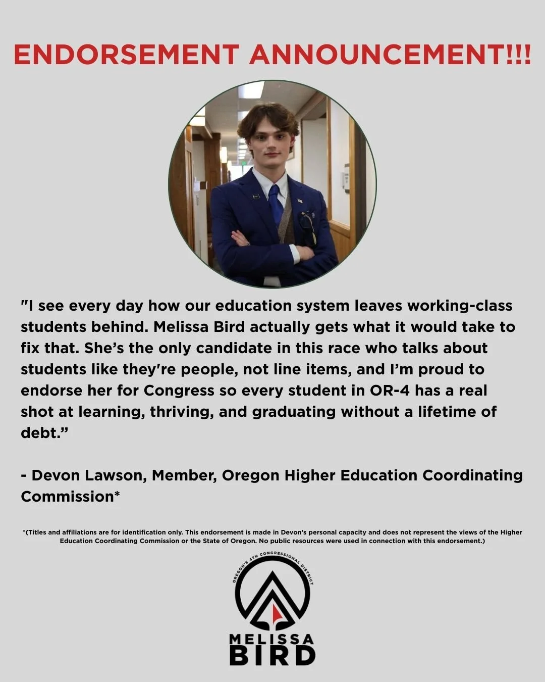 • Devon Lawson, Member, Oregon Higher Education Coordinating Commission* (*Titles and affiliations are for identification only. This endorsement is made in Devon’s personal capacity and does not represent the views of the Higher Education Coordinating Commission or the State of Oregon. No public resources were used in connection with this endorsement.)